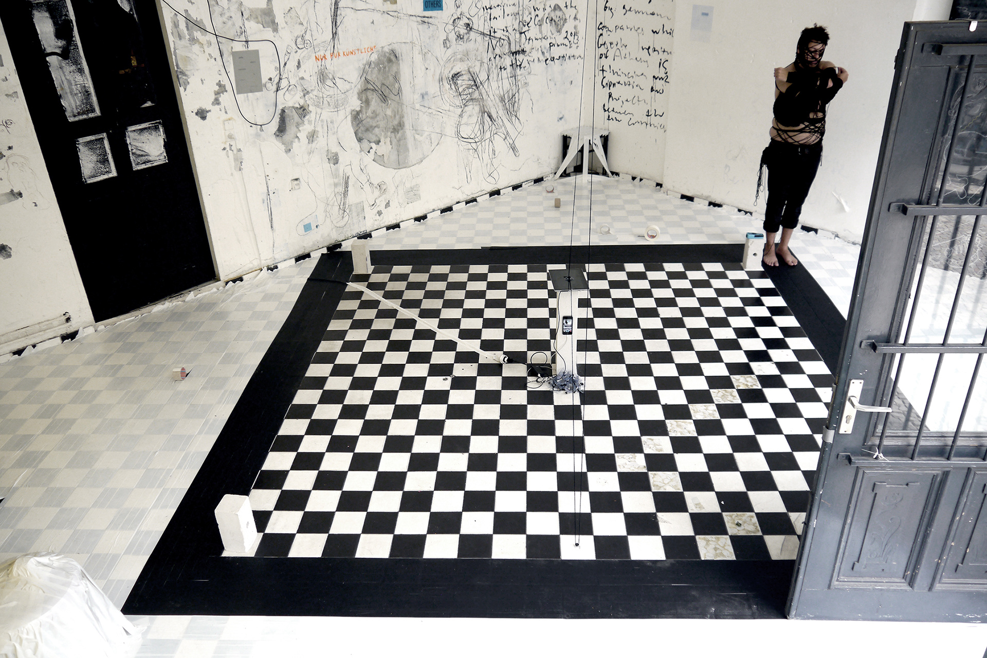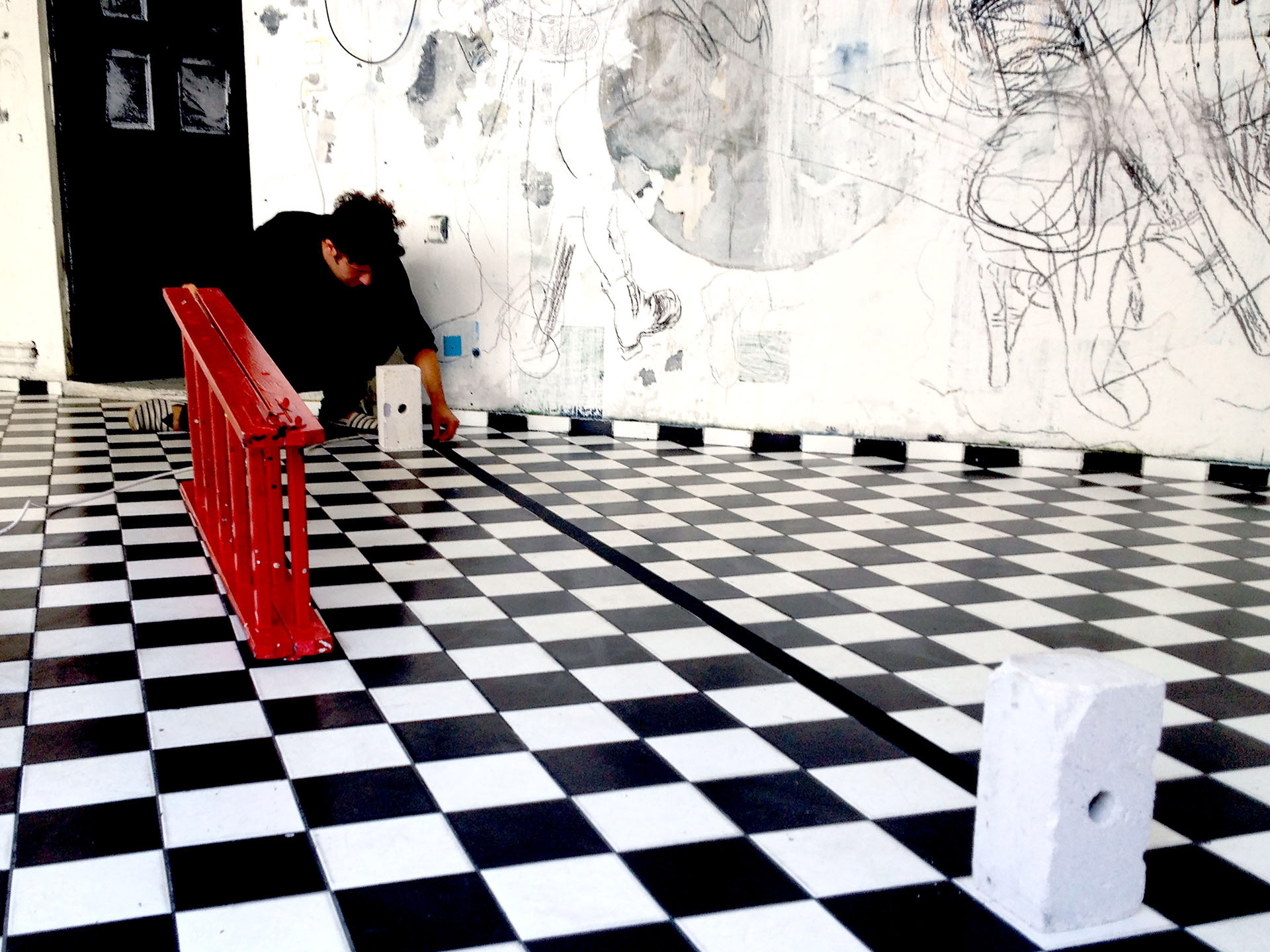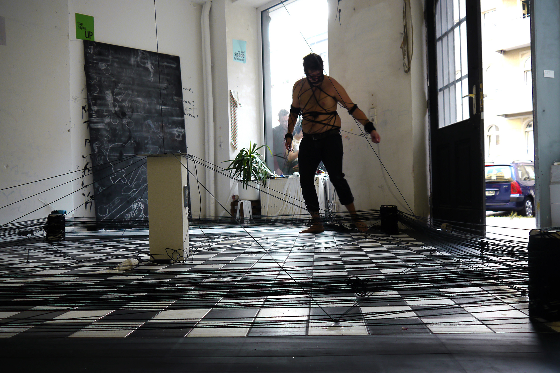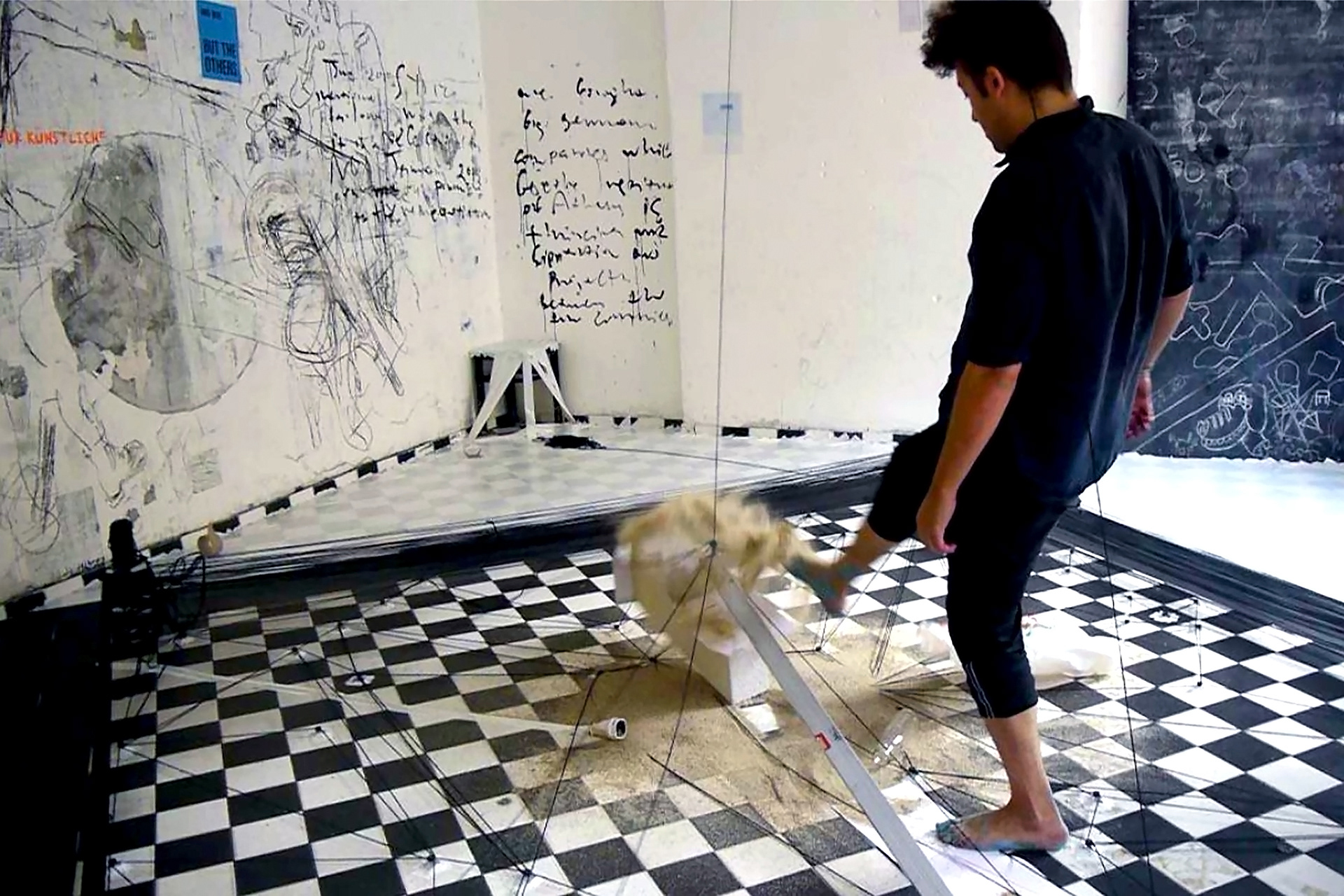 Description: Three 8-hour performance / installation with tape, yarn, concrete, video, paper, sand, ink, and paint